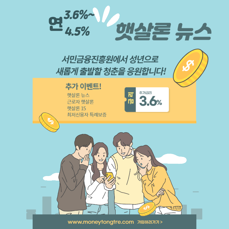 ● '햇살론 뉴스'는 만 19세 ~ 34세 사이의 연소득 3500만원 이하의 사회초년생이나 취업준비생, 대학생들을 대상으로 최대 1,200만원까지 대출이 가능한 상품입니다. 대출 금리는 연 3.6%~4.5% 전후로 저렴합니다.