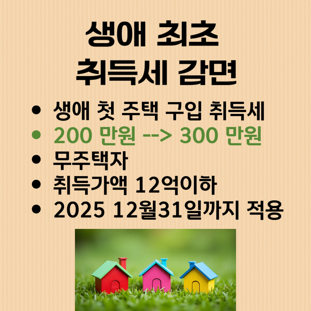 - 생애 첫 주택 취득세 감면 연장: 신혼·청년층의 첫 내 집 마련 부담을 덜기 위해 감면이 계속됩니다.