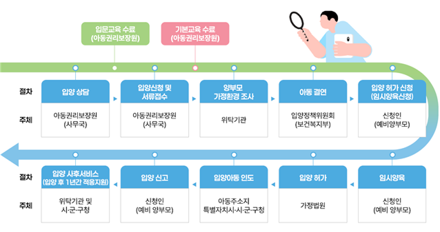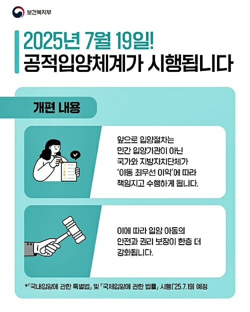 대한민국은 2025년 7월 19일부터 입양 절차를 공적 체계로 전환하며 입양 절차를 강화했습니다. 이는 아동의 최선의 이익을 최우선으로 보장하고, 입양 전반에 대한 국가와 지방자치단체의 책임과 관리·감독을 강화하는 것을 목표로 합니다.