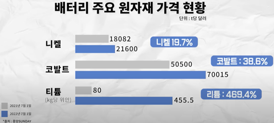 전기차 베터리에 들어가는 주요 원자재들의 가격을 보면 상승 폭이 대단합니다. 작년 7월기준 부터 올해 7월까지를 비교해보면 니켈은 1년에 19.7%가 올랐고 코발트는 38.6%, 리튬운 kg당 위안 가격이 무려 469.4%나 올럈습니다.