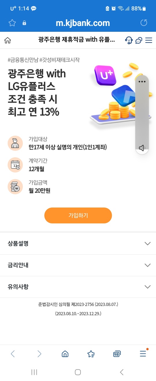 유플러스닷컴과 함께하는 광주은행 제휴예금을 소개합니다 힘들게 번 돈을 높은 이자로 광주은행에서 특판적금 최고 13.00% 만기 12개월 정기적금이 있습니다. 현명한 적금 방법을 찾고 계십니까