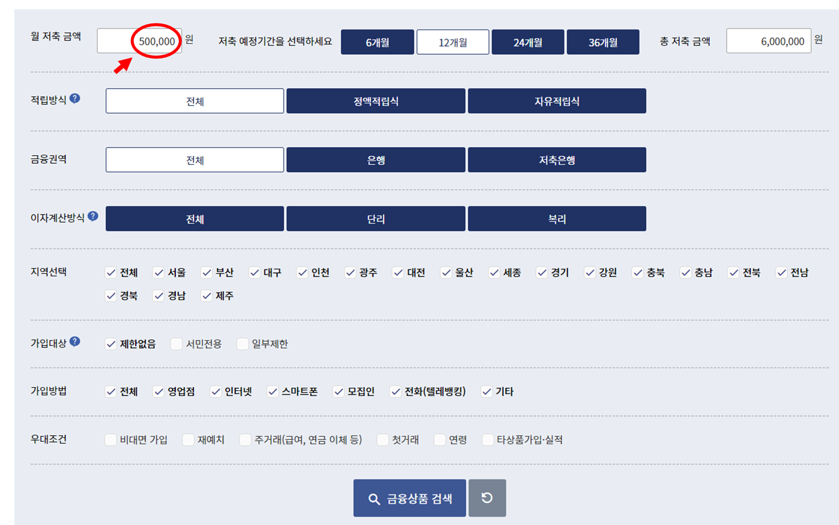 [경로] 위 상단 "저축" ㅡ> 적금 ㅡ> ①월 저축금액과 ②기간등을 본인 맞춤형으로 입력하시고 ㅡ> 아래 금융상품검색