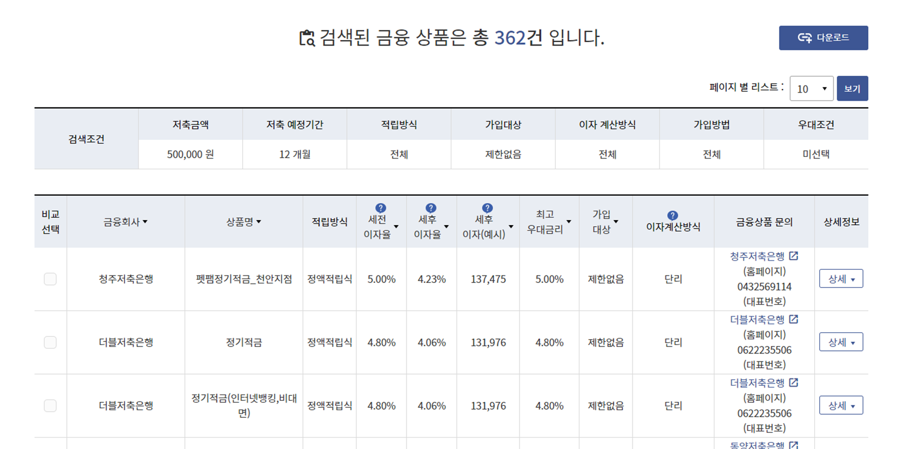 ■ 검색 결과가 총 362건으로 은행 마다 업데이트된 상품들이 높은 이자율 별로 차례대로 보이고 있습니다
