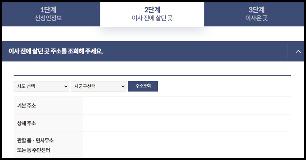 [2단계입니다 이전에 살던곳 주소 입력 하시면 되겠습니다]