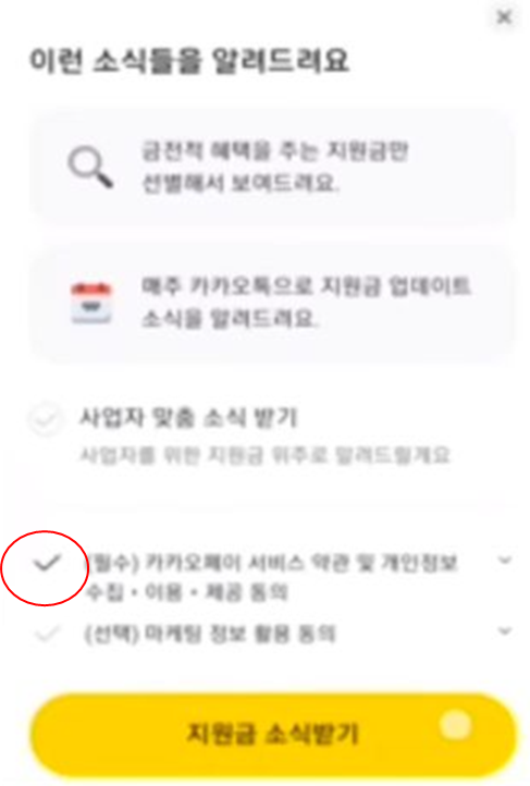 7. 필수"체크"(✓), 지원금 소식받기 클릭