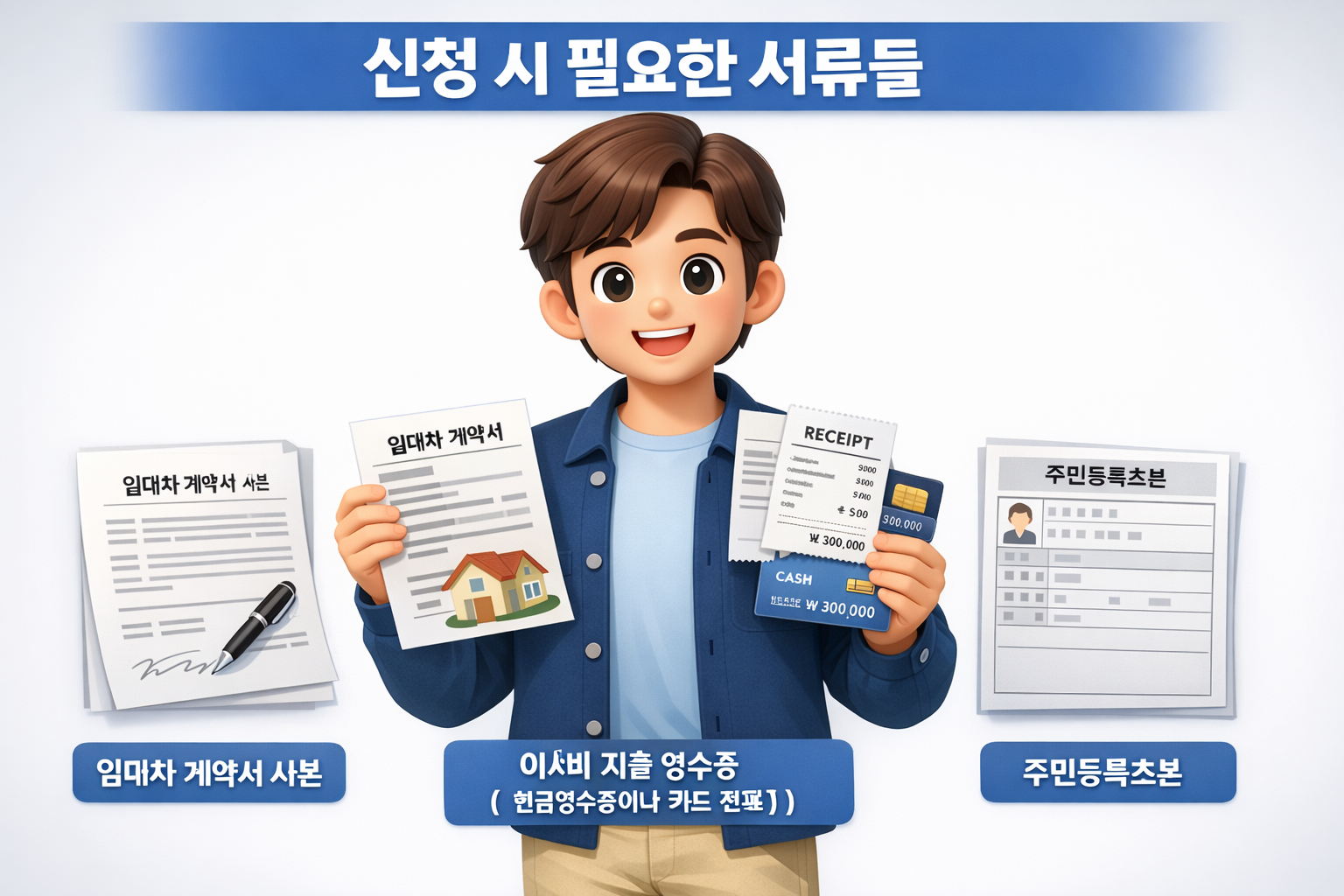 임대차 계약서 사본, 이사비 지출 영수증(현금영수증이나 카드 전표), 주민등록초본 등이 필요합니다. 모든 결제는 본인 명의로 하고 영수증을 꼭 챙겨두셔야 합니다.