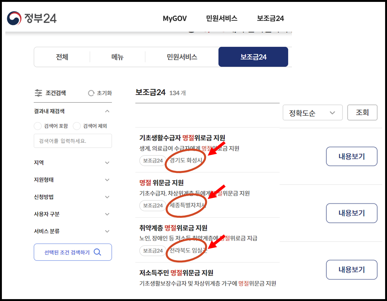 ① 정부24시 홈페이지 접속 >> ②보조금24(클릭) >> ③내가 살고있는 지자체 찾기 '내용보기'(클릭)