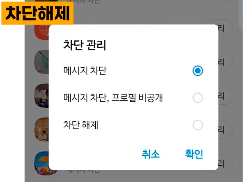기본적으로 할 땐 이렇게 메시지 차단으로 되어 있기 때문에 내 프로필도 보여주고 싶지 않다라고 하면 메시지 차단 프로필 비공개 확인해 주시면 되고 혹시라도 잘못 누가 차단이 됐다라고 하실 경우에는 이렇게 차단해제 하시고 확인 눌러 주시면 다시 차단 해제를 할 수가 있습니다