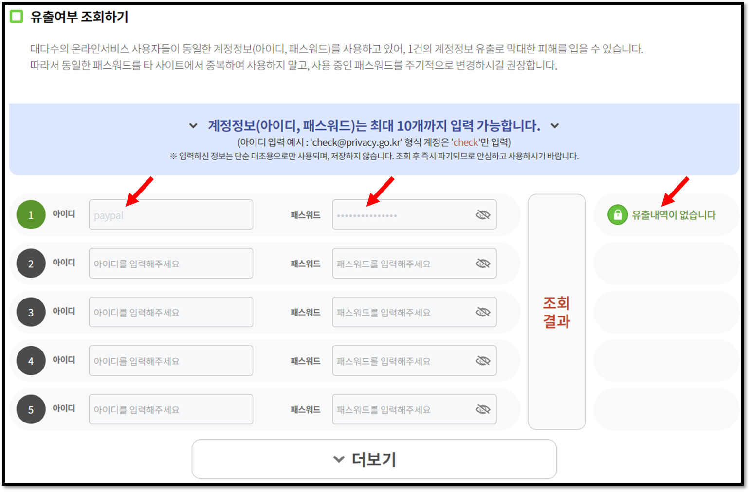 아이디와 패서드의 유출 여부를 확인하기 위해서 본인이 사용하는 아이디와 패스워드를 최대 10개까지 입력할 수 있습니다.