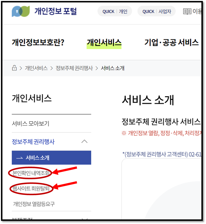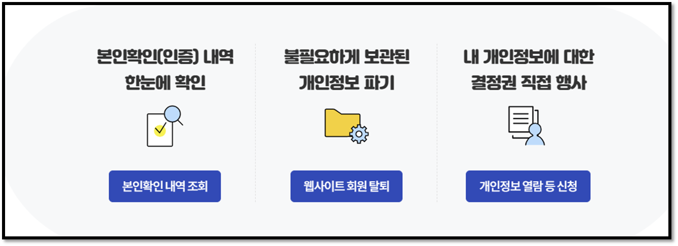 본인 확인 내역 조회와 웹사이트 회원 탈퇴 두 가지 기능을 활용할 수 있습니다. 본인 확인 내역 조회는 본인 인증 이후에 휴대폰, 신용카드 등을 이용해서 본인확인 인증을 했던 모든 내역을 한번에 볼 수 있습니다.
