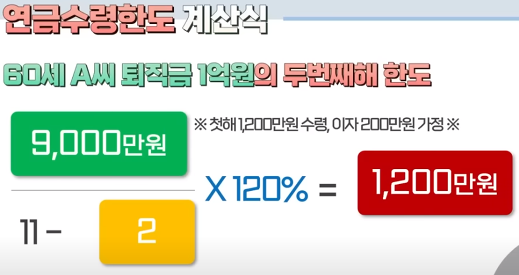 첫 번째 조건을 알겠는데 두 번째 조건이 생소하시죠 퇴직금을 연금으로 받을 때는 일정 금액 이상을 찾지 못합니다 즉 한 해 찾을 수 있는 한도가 있는데요 계산식은 다음과 같습니다 먼저 연금계좌의 평가액을 확인하고요 즉 계좌에 얼마가 들어있는지 확인하는 거죠 그걸 11 - 연금 수령 연차로 나눕니다이 얘기는 적어도 10년 이상은 받아야 한다는 거죠 마지막으로 120%를 곱해주면 그 연금 수령 한도가 되는데요 이렇게 설명드리면 복잡하죠 그래서 예를 들어보겠습니다