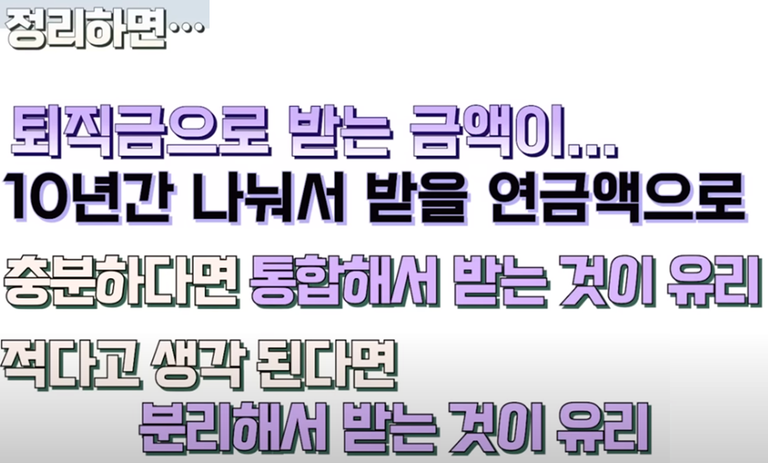 이런 부분을 고려한다면 통합해서 하나의 계좌로 받는 것이 유리합니다 하나로 통합한다면 자산을 운영하기도 편하겠죠 하지만 퇴직금이 적다면 얘기가 달라집니다 퇴직금으로 3천만원을 받았다면 1년에 360만원 최대 월 30만원까지 받을 수 있는데요 이렇게 월 받을 수 있는 금액이 적다면 통합해서 받는 것보다 퇴직금을 다른 irp로 받아서 기존 정립ip와 같이 연금을 수령하는 것이 좋겠죠 정리하면 퇴직금으로 받는 금액이 10년간 나눠서 받을 연금액으로 충분하 보면 기존 연금 계좌에 통합해서 받는 것이 유리하고요 적다고 생각된다면 분리해서 받는 것이 유리합니다