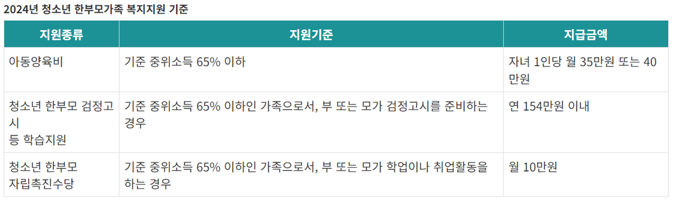 청소년 한부모 가정에서 24개월 미만 자녀를 양육하는 경우 양육비 추가 지원이 예정되어 있습니다. 지원금액은 아직 확정되지 않았습니다. 아동 양육비에 대한 더 많은 정보는 이후에 안내될 예정입니다.