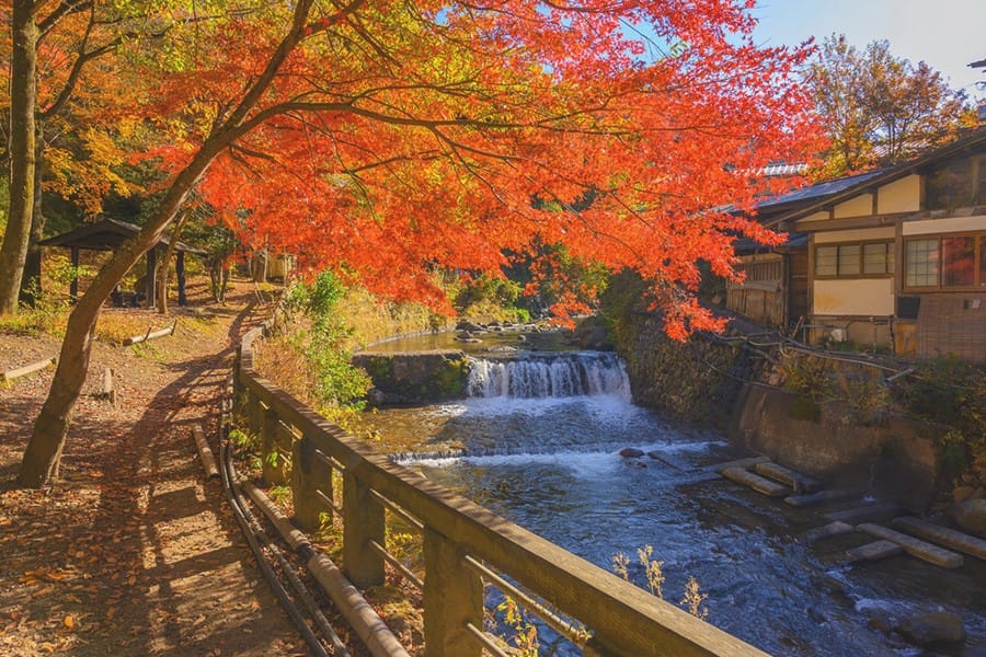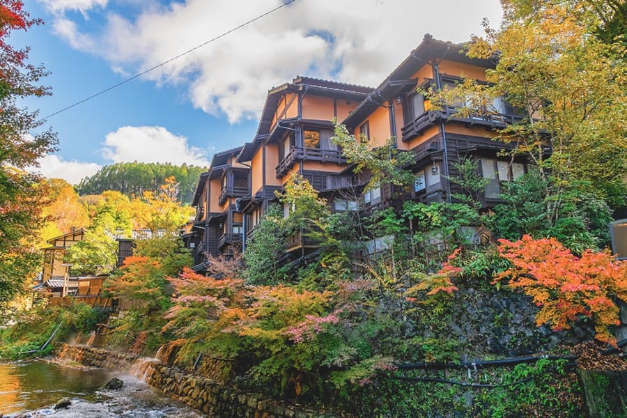일본 분위기로 자연의 색과 재료, 목조 건물과 흙벽, 돌계단과 흐르는 강이 마을 풍경의 분위기는 눈에 많이 익은 우리나라에서 볼수있는 분위기로 마을에는 료칸, 대중목욕탕, 상점, 카페가 있습니다.