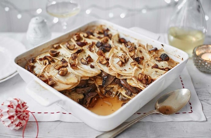 7. 접시를 호일로 덮고 30분 동안 굽습니다. 껍질을 벗기고 밤을 뿌린 다음 셀러리를 완전히 익히고 위에 황금색이 될 때까지 25분 더 굽습니다. 접시에 숟가락으로 떠서 채소와 함께 드시면 됩니다.