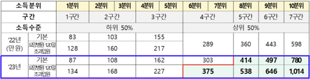 소득에 따라 본인 부담 상한액이 달라지며, 2023년 기준으로 상한액이 변경되었습니다. 예를 들어, 1분위는 87만원, 6-7분위는 303만원, 10분위는 780만원입니다. 소득이 높을수록 상한액도 높아지게 조정되었습니다.