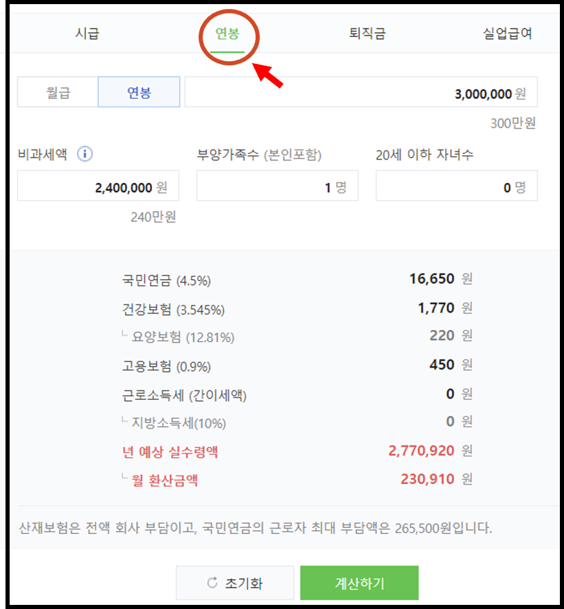 2024년 연봉 계산을 기준으로 300만원을 기준으로 계산해보면 총 월 환산 금액 230,910원으로 연 예상 실수령액은 2,770,920원 입니다.