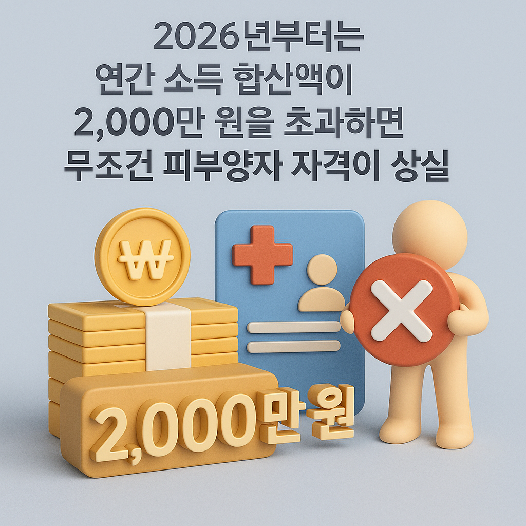 가장 민감한 부분은 역시 피부양자 제외 기준입니다. 2026년부터는 연간 소득 합산액이 2,000만 원을 초과하면 무조건 피부양자 자격이 상실되어 지역가입자로 전환됩니다.