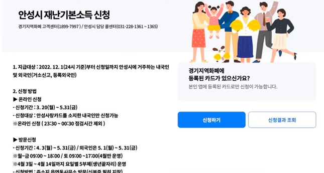 안성시는 코로나가 장기화되고 경기침체로 힘든 서민경제를 지원합니다 안성시의 모든 시민들을 대상으로 1인당 5만원씩 지역화폐로 지급을 하는데요 지급 대상은 22년 12월 1일부터 신청일까지 안성시에 거주하는 내국인과 외국인입니다 안성시 홈페이지에서 온라인 신청을 받고 있고 방문신청은 주소지 읍면동사무소로 신분증을 지참해서 방문하시면 됩니다 신청기간은 5월 31일까지인데요 안성 사랑카드의 충전 방식으로 지급됩니다 안성시 지역화폐 가맹점에서 사용이 가능하고 23년 8월 31일까지만 사용이 가능하니까 참고해 주시면 좋겠습니다