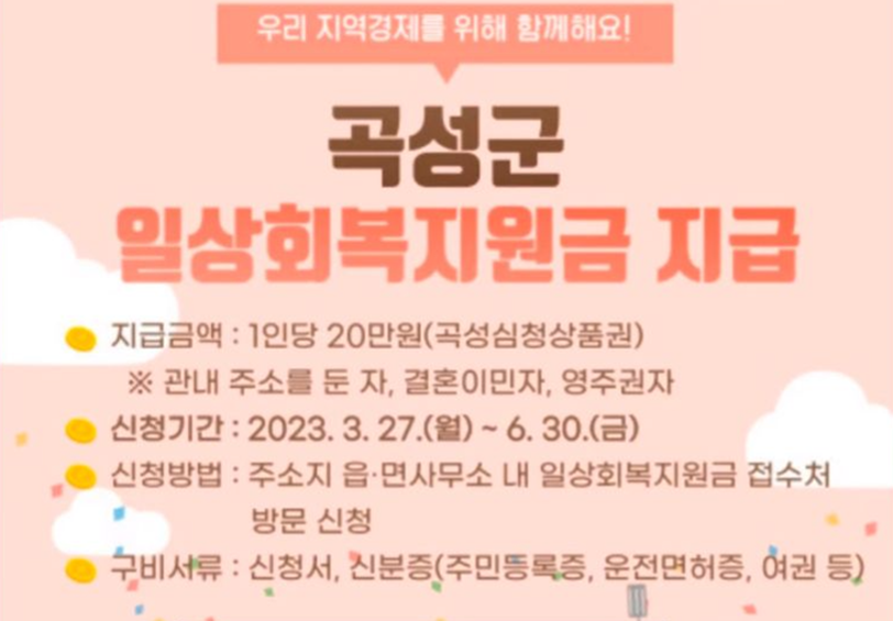 전라남도 곡성군입니다 곡성군에서는 위축된 지역경제 활성화와 곡성군민의 행복하고 안정된 생활을 위해서 모든 국민에게 일상 회복지원금을 지급합니다 1인당 20 곡성 심청 상품권으로 지급하는데요 지급 대상은 23년 3월 12일 24시를 기준으로 곡성군의 주소를 둔 사람이며 영주권자와 결혼 이민자도 포함됩니다 신청은 주소지 읍면사무소에 일상 회복지원금 접수처에서 가능합니다 신분증 꼭 챙겨 가시고요 신청기간은 6월 31일까지인데요 아직 시간 여유 있다고 밀어 놓지 마시고 최대한 빨리 신청하셔서 받아보시면 좋겠습니다 참 고동이 불편하신 분들께는 마을 담당 공무원이랑 이장님이 2인 1조로 가정 방문 서비스를 제공한다고 합니다