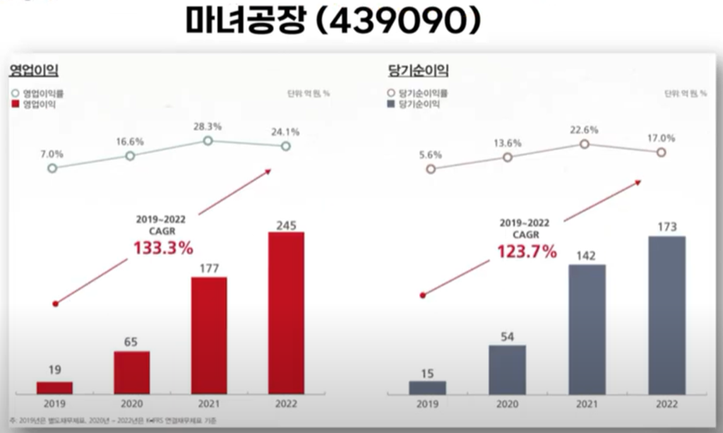 마녀공장의 영업이익률은 꾸준하게 20% 위쪽을 계속해서 유지를 해주고 있는 상황입니다. 지금 보시면은 영업이익이 21년 177억원에서 245억원으로 굉장히 많이 떠졌습니다.