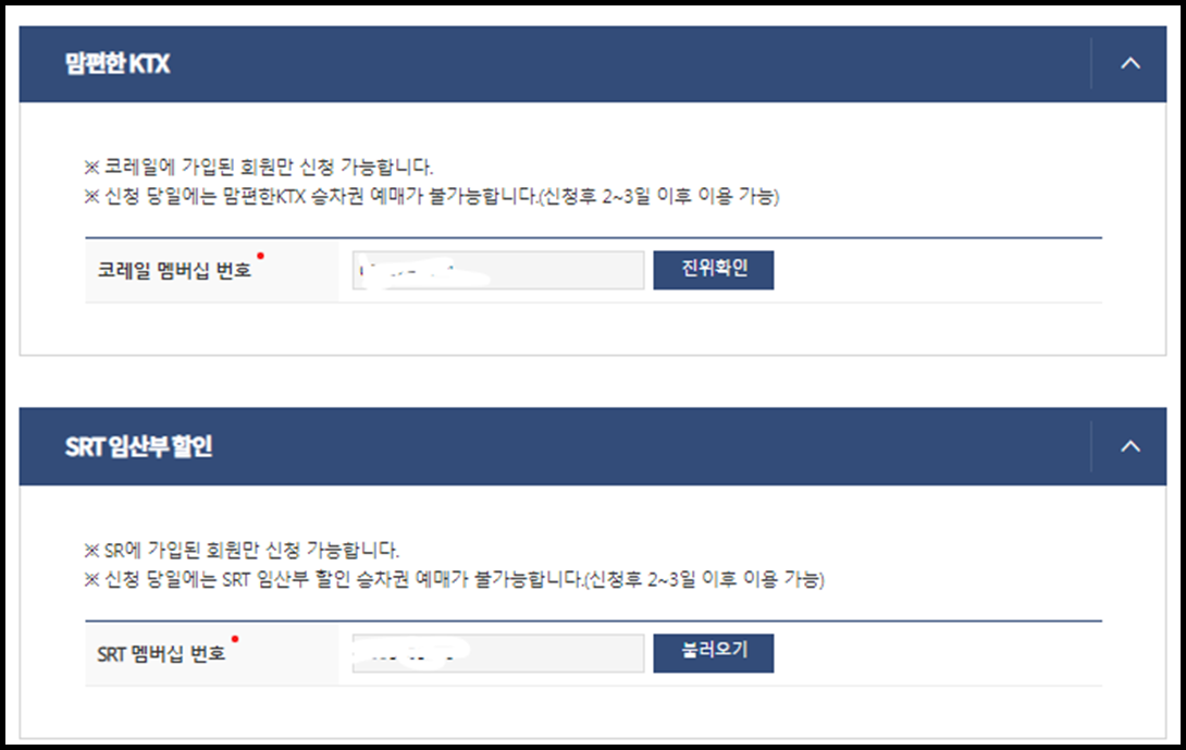 2. 멤버십 번호를 입력해야해서 미리 코레일(KTX), SRT사이트에서 가입 하신후 오시면 됩니다