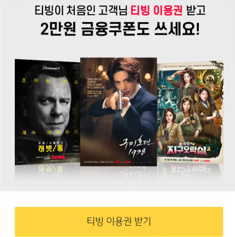 회원가입을 하고 티빙에 친구를 초대하면 참가자가 스타벅스 커피 세트 또는 자동케시되는 금융 쿠폰 2만원도 받을 수 있는 프로모션이 있습니다.