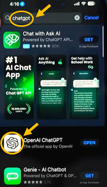 지금 막 출시된 iPhone용 채팅 GPT를 설치하려면 App Store로 이동하여 사진에 있는 로고로 Open AI chat GPT 클릭하고 다운로드 하세요